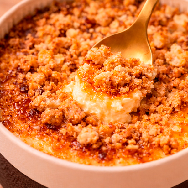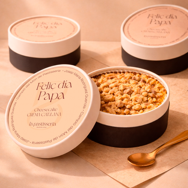 Cheesecake al forn amb un toc de canyella i llimona, amb una fina capa de sucre caramel·litzat que es fon a la boca, i cruixent de carquinyolis arrebossats amb xocolata blanca caramel·litzada