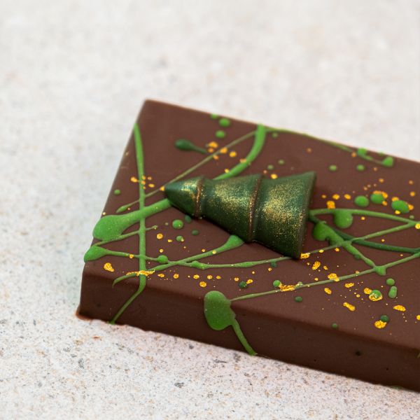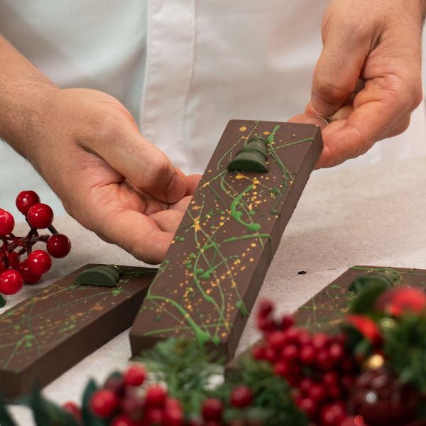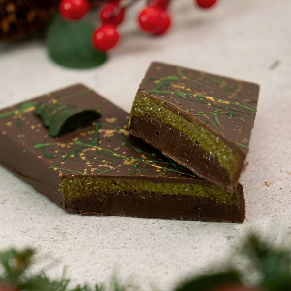 Praliné de pistatxo amb kataifi cruixent, trufa de xocolata negre 70%.